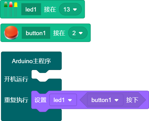 按钮开关积木,左图表示Button1接在Arduino的2号引脚。