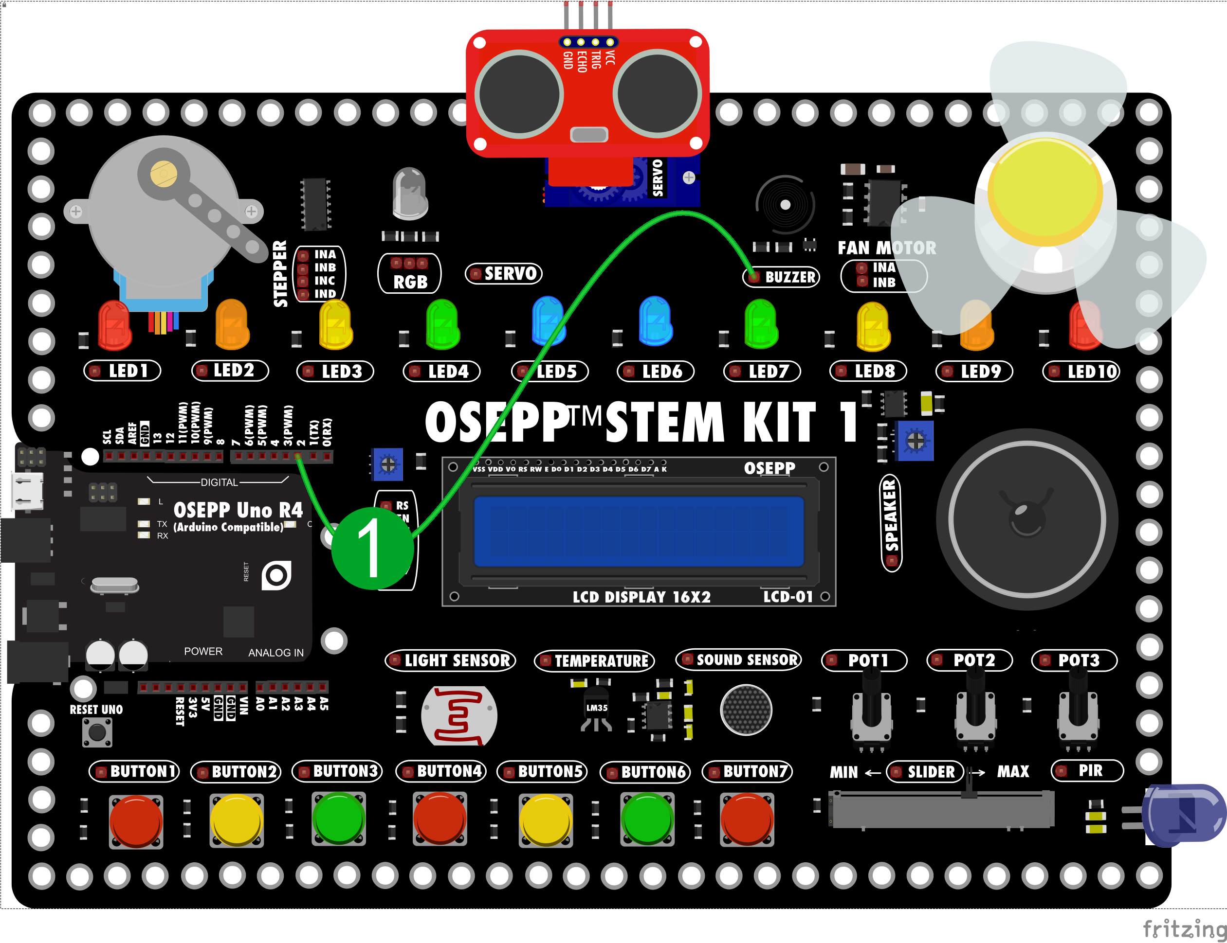 把蜂鸣器BUZZER的端子接到OSEPP UNO的2号引脚。