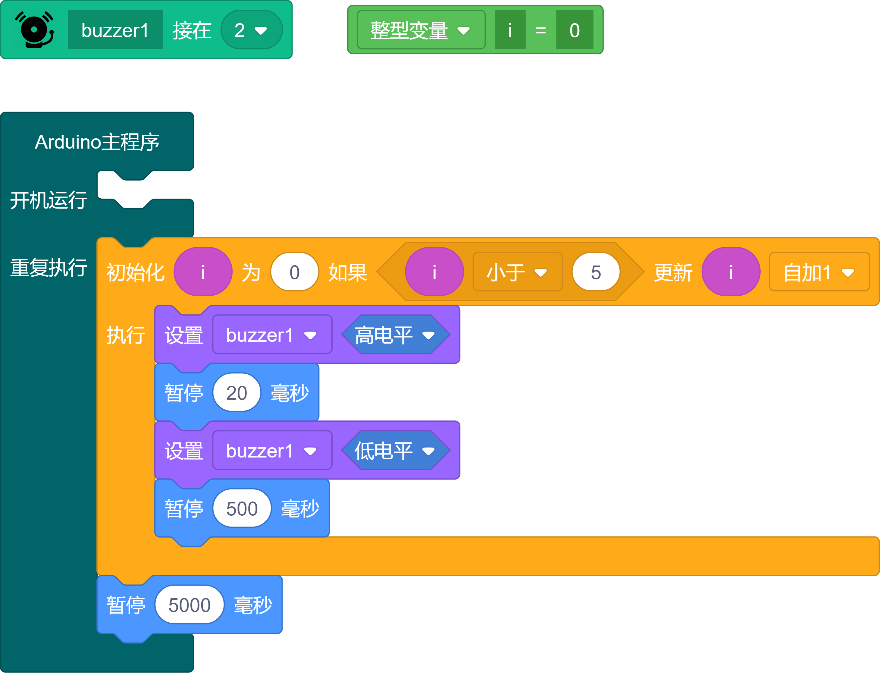 蜂鸣器每半秒蜂鸣器响一次,连续5次,之后暂停5秒再次进入循环。