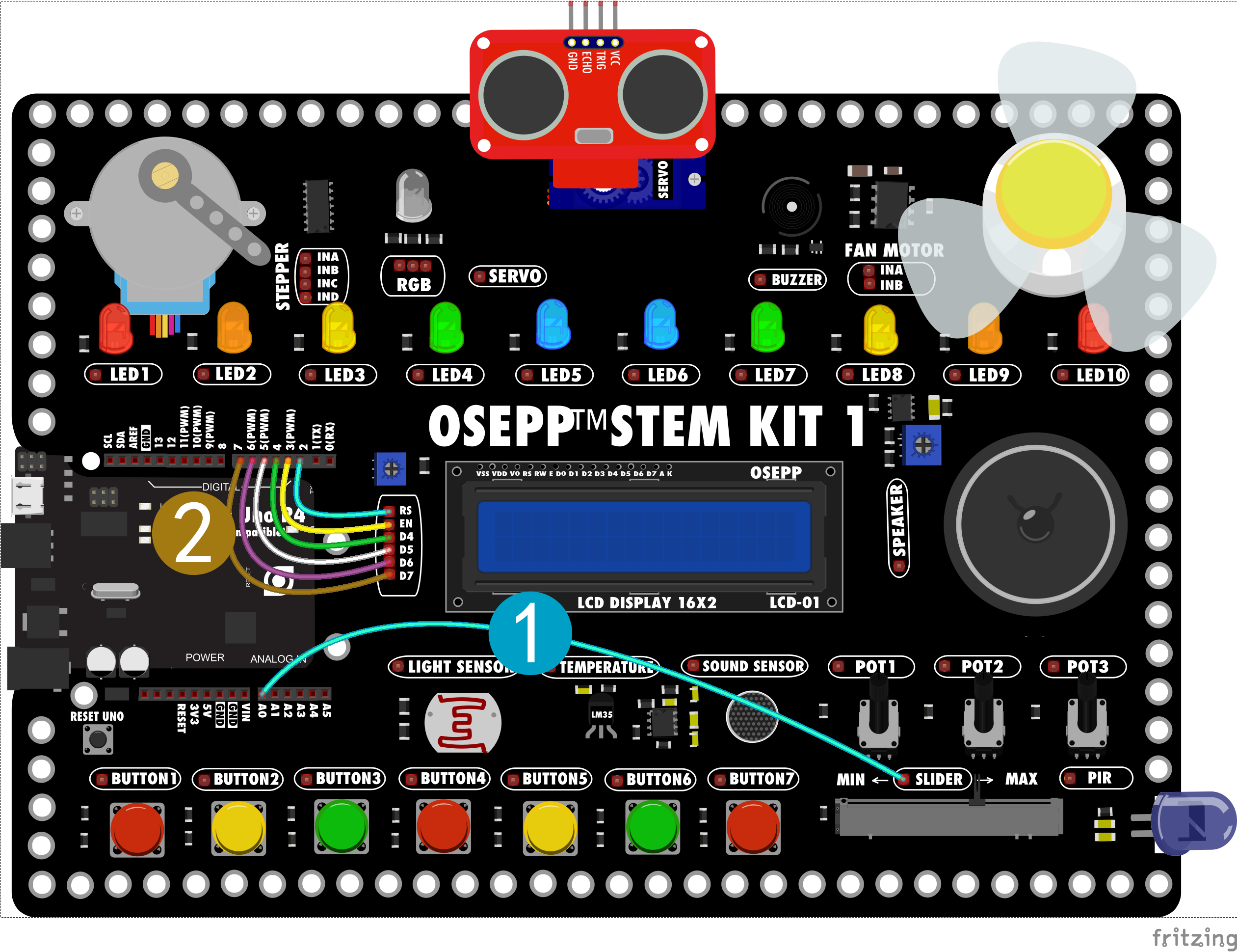 1.把滑块电位器slider1接到OSEPP UNO的A0引脚。