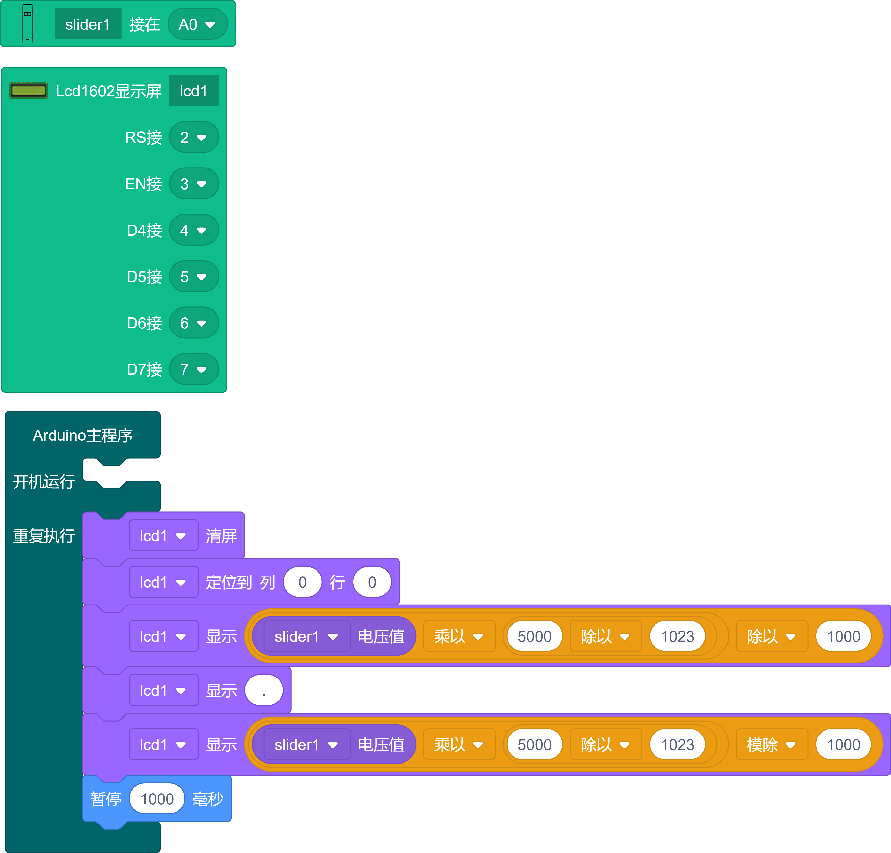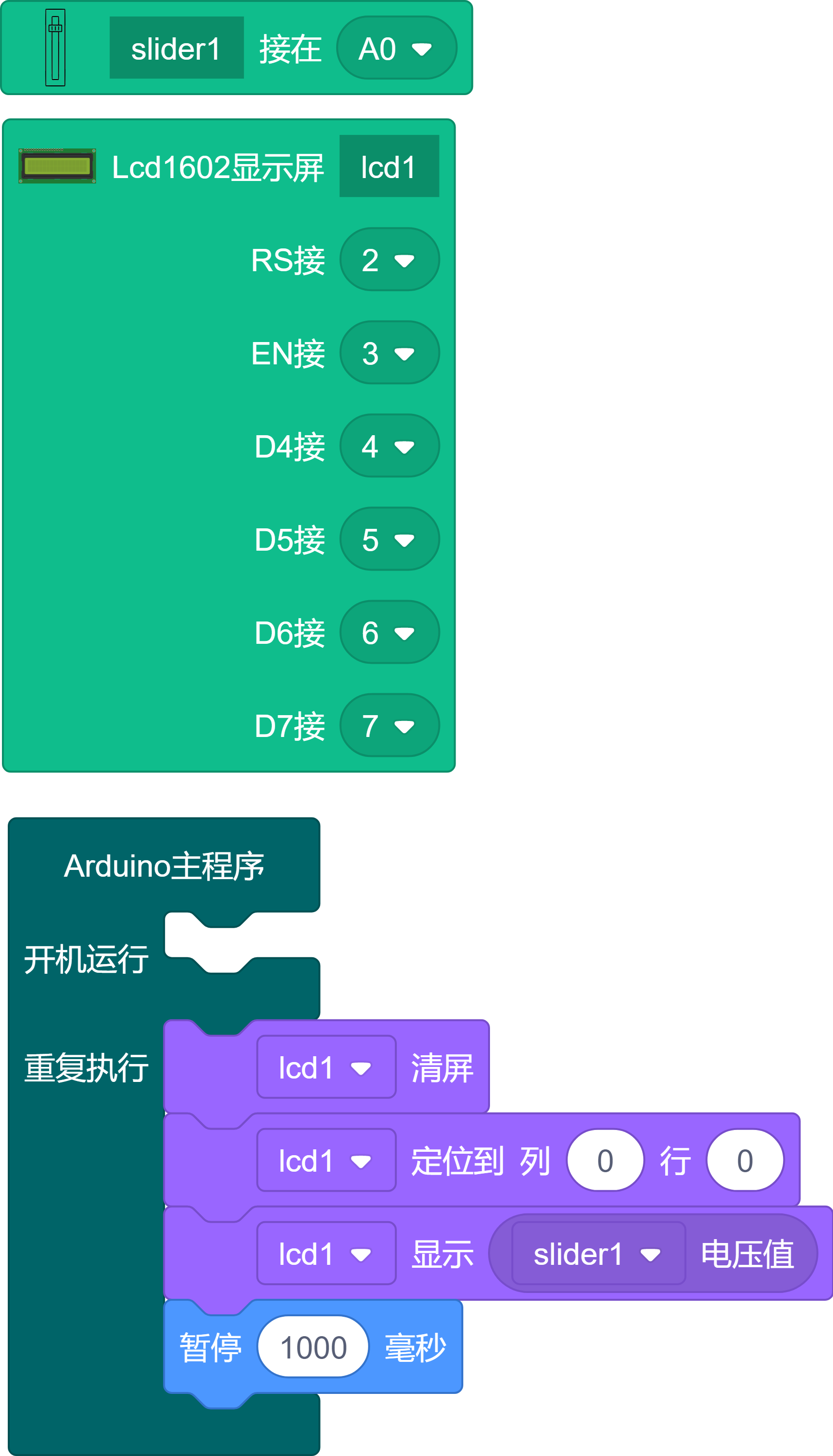#include <LiquidCrystal.h> LiquidCrystal lcd1(2, 3, 4, 5, 6, 7); //定义LCD的引脚 void setup() { lcd1.begin(16, 2); //LCD初始化 //slider1 pinMode(A0, INPUT); //定义滑块电位器连接的引脚为输入模式 } void loop() { lcd1.clear(); //清屏 lcd1.setCursor(0, 0); //设置光标位置在0行,0列(左上角) lcd1.print(analogRead(A0)); //显示滑块电位器的值 delay(1000); //延时1000毫秒 }1
