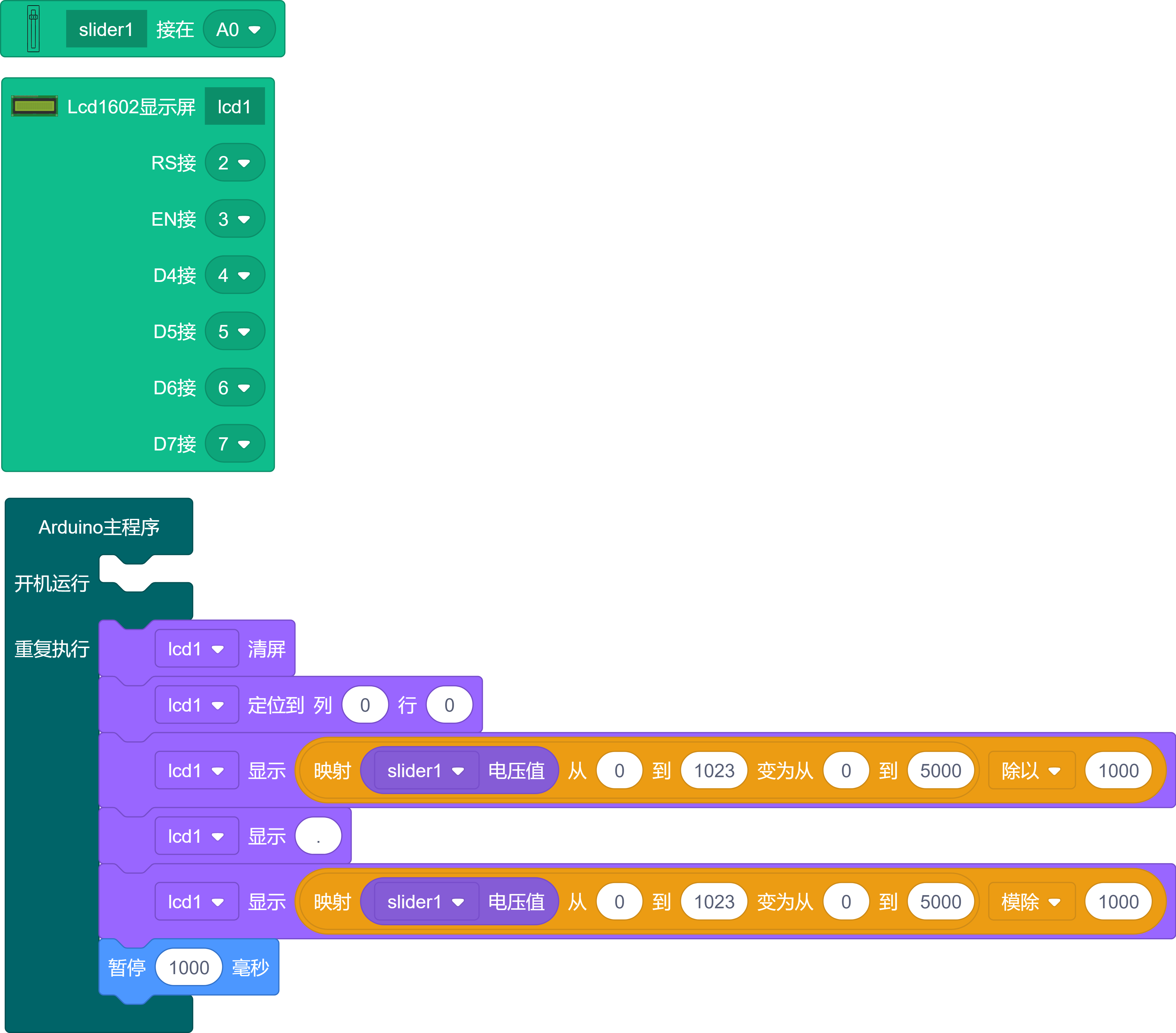 lcd1.print(map(analogRead(A0), 0, 1023, 0, 5000) / 1000); //计算整数部分