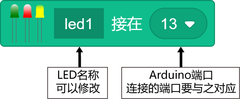 LED1对应上图的LED模块积木的名称。如果有多个LED,请点击名称处的三角箭头,从拉列表选择 所 要设置的LED。