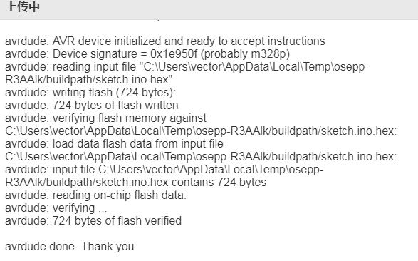 当窗口最后内容出现...Thank you.字样时,表示程序已经上传完成并写入到OSEPP UNO控制板中。