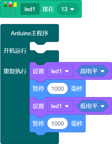 void setup() { //led1 pinMode(13, OUTPUT); //定义13号引脚为输出模式 } void loop() { digitalWrite(13, HIGH); //13号引脚输出高电平 delay(1000); //延时1000毫秒 digitalWrite(13, LOW); //13号引脚输出低电平 delay(1000); ////延时1000毫秒 }1