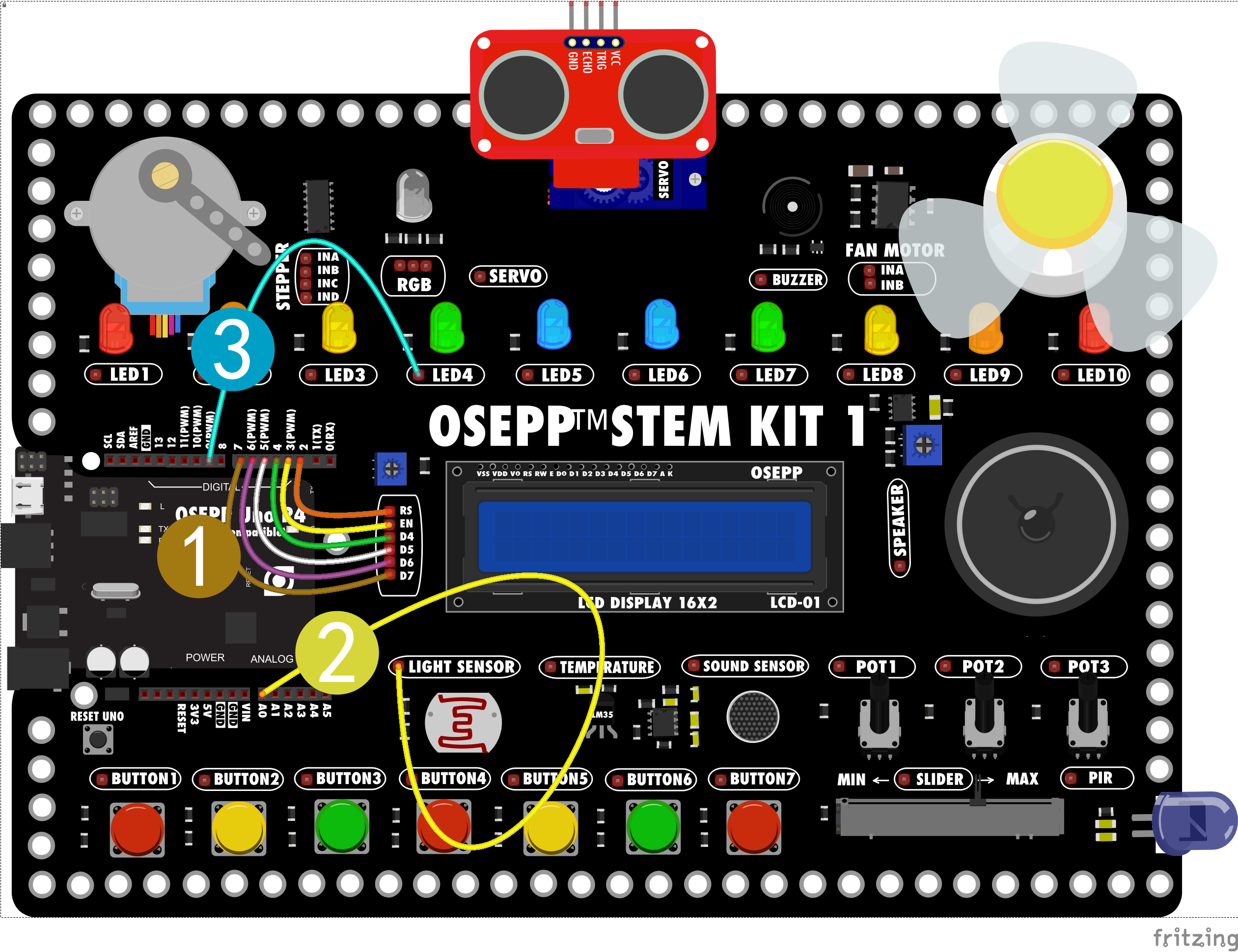 3.LED4的端子连接到OSEPP UNO的9号引脚。
