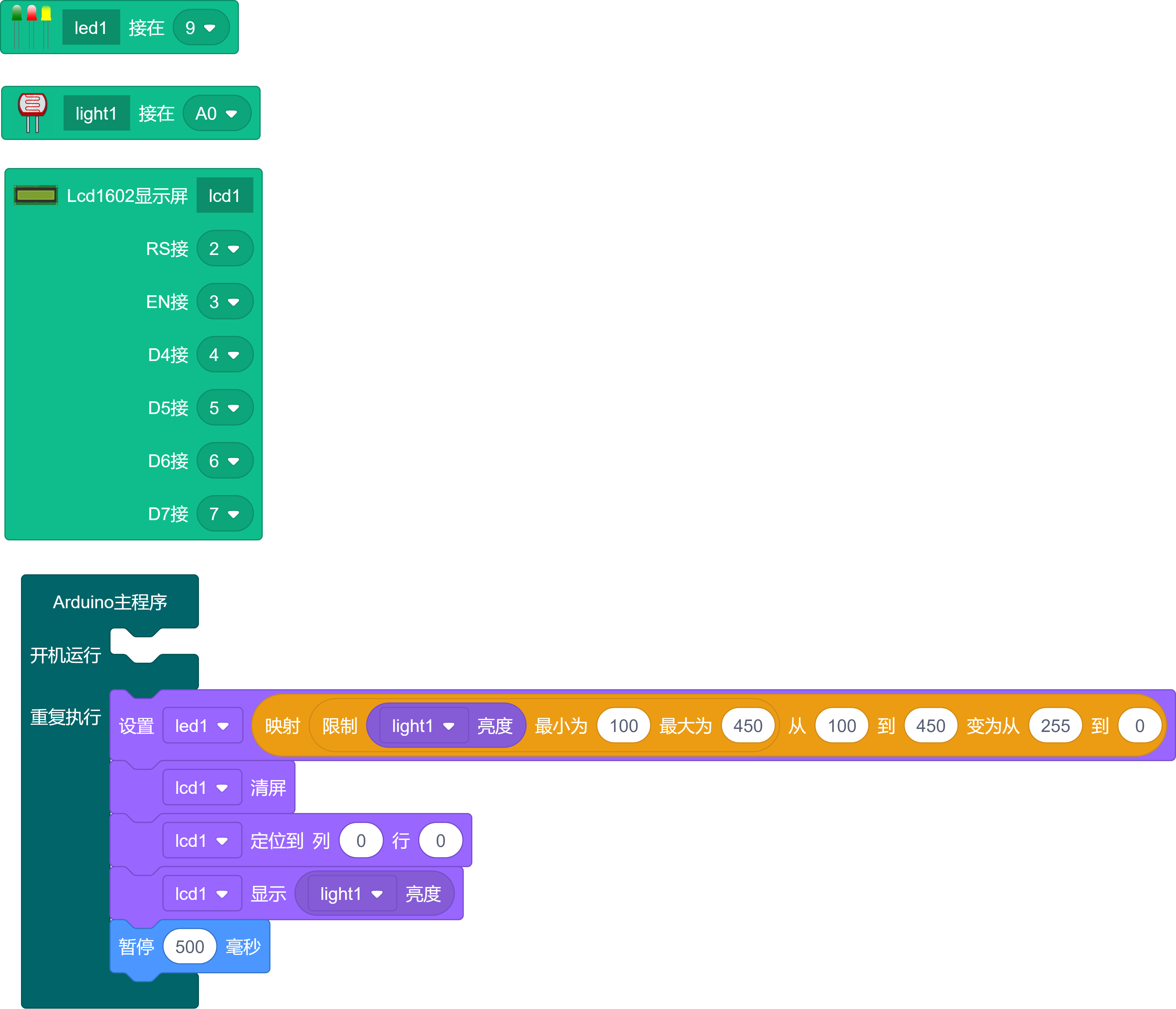 程序里面我们限制了光线传感器的值最小值是100最大值是450,这是为了防止光线变化超出映射值范围时程序失效。当然你可以更改这个值,当光线最暗时,LCD显示的是最小值,光线最亮时,LCD显示的就是最大值,把这两个值填入积木里面。