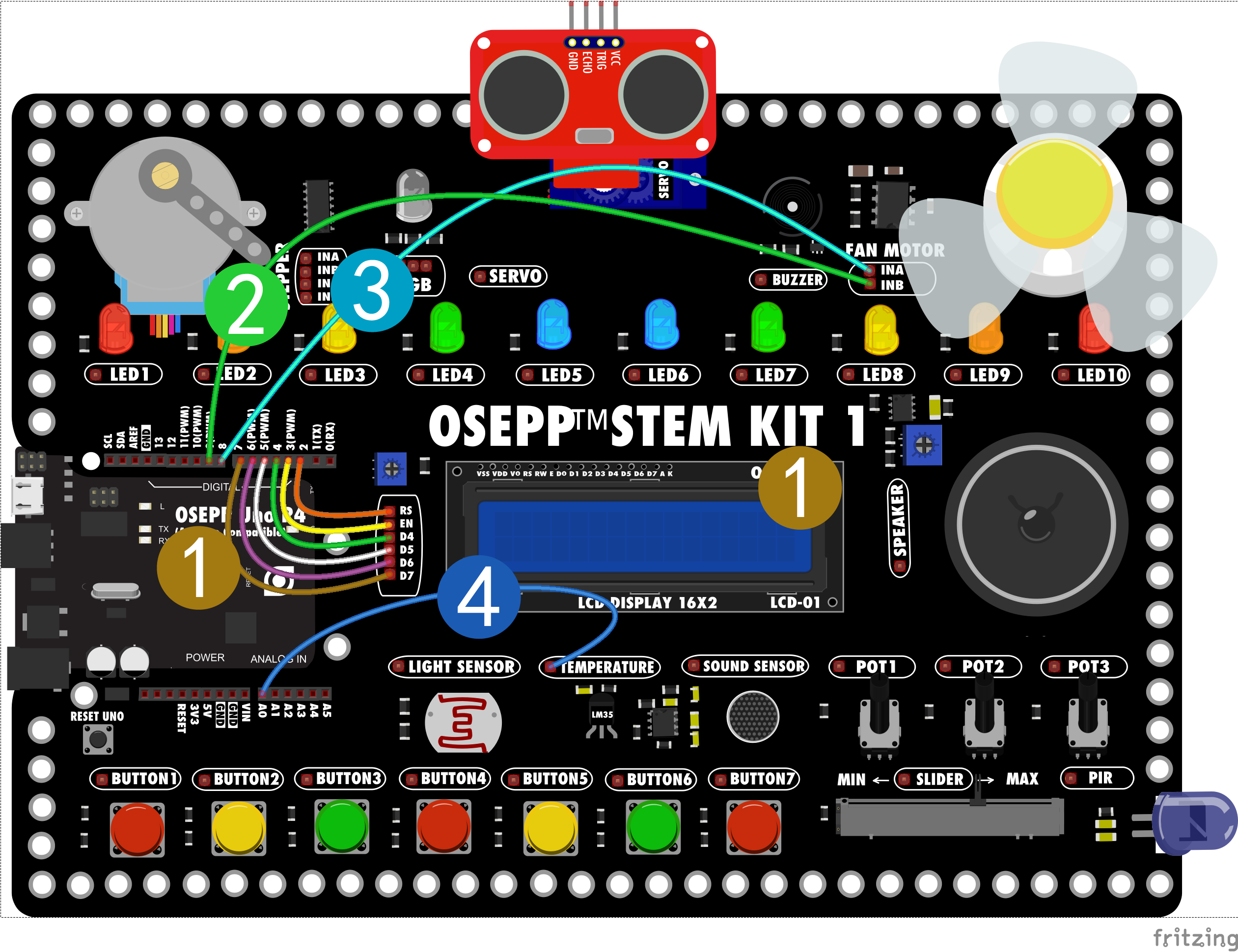 RS-D7分别连接到OSEPP UNO的2~7号引脚。