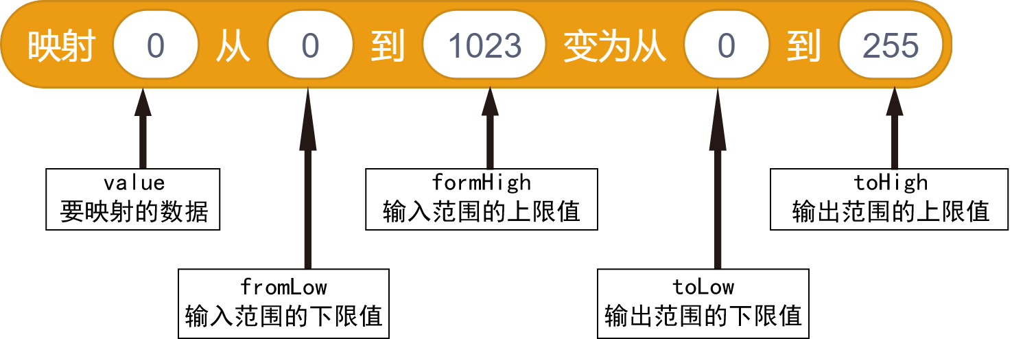 函数原型:map(value, fromLow, fromHigh, toLow, toHigh)