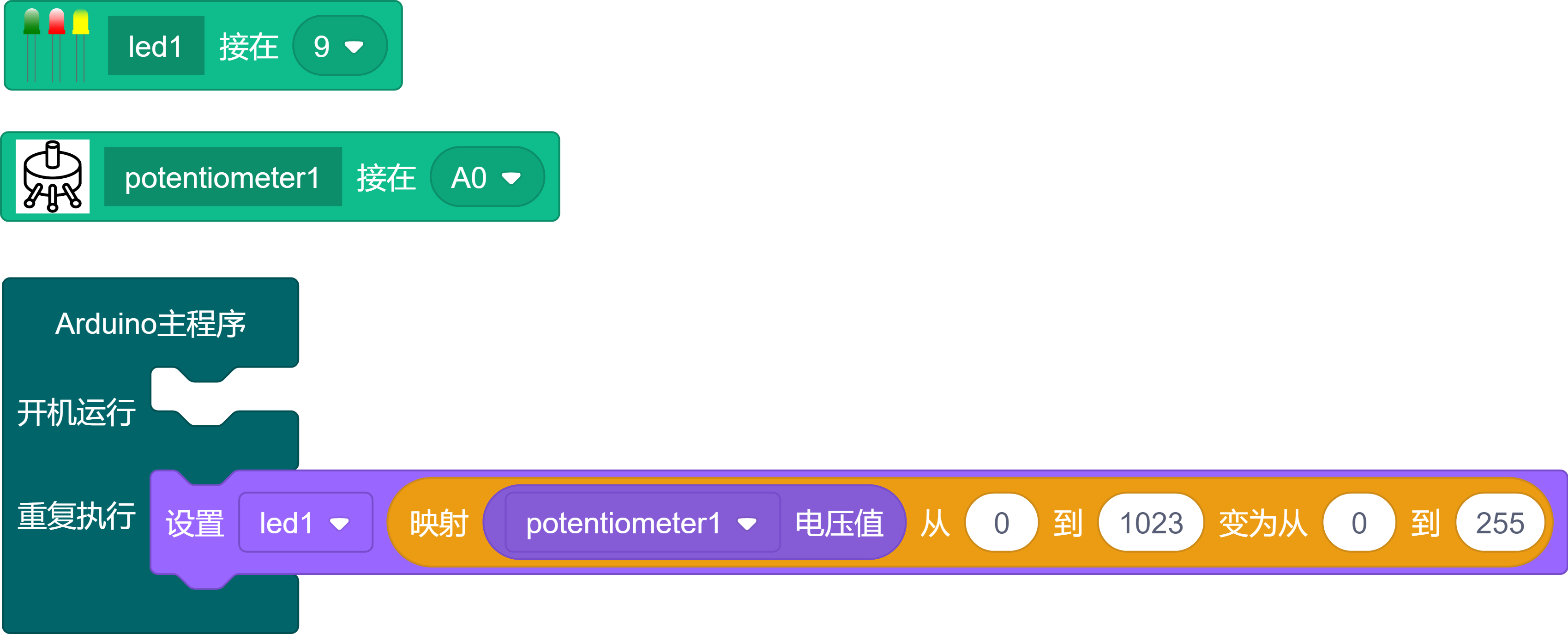 本实验将电位器连接到Arduino,通过映射函数来调节LED的亮度。