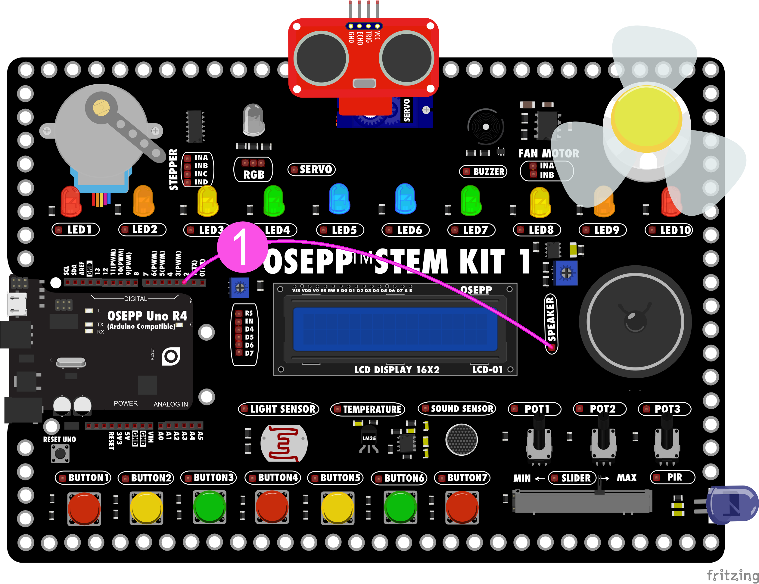 把扬声器SpeaKer的端子接到OSEPP UNO的2号引脚。
