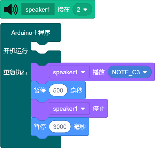 上传代码后,扬声器就能发出c3音调声音0.5秒,然后暂停3秒。
