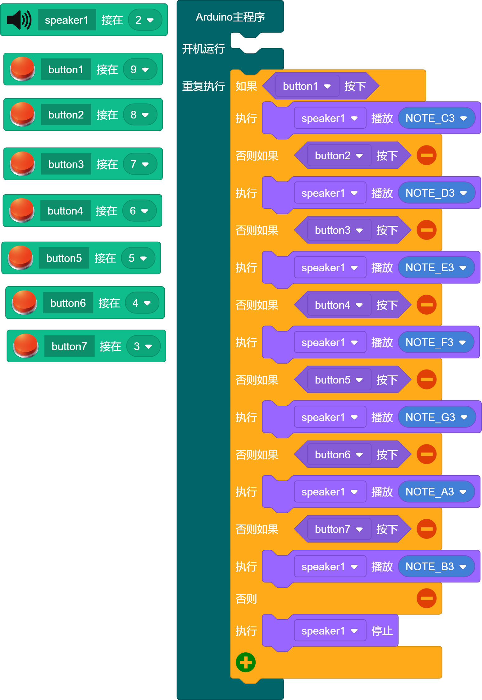 上面的实验让扬声器只发出一个声音显得太无趣,接下来我们要让扬声器发出不同的声调。并且使用一个个开关控制一个声调,就像电子琴一样。
