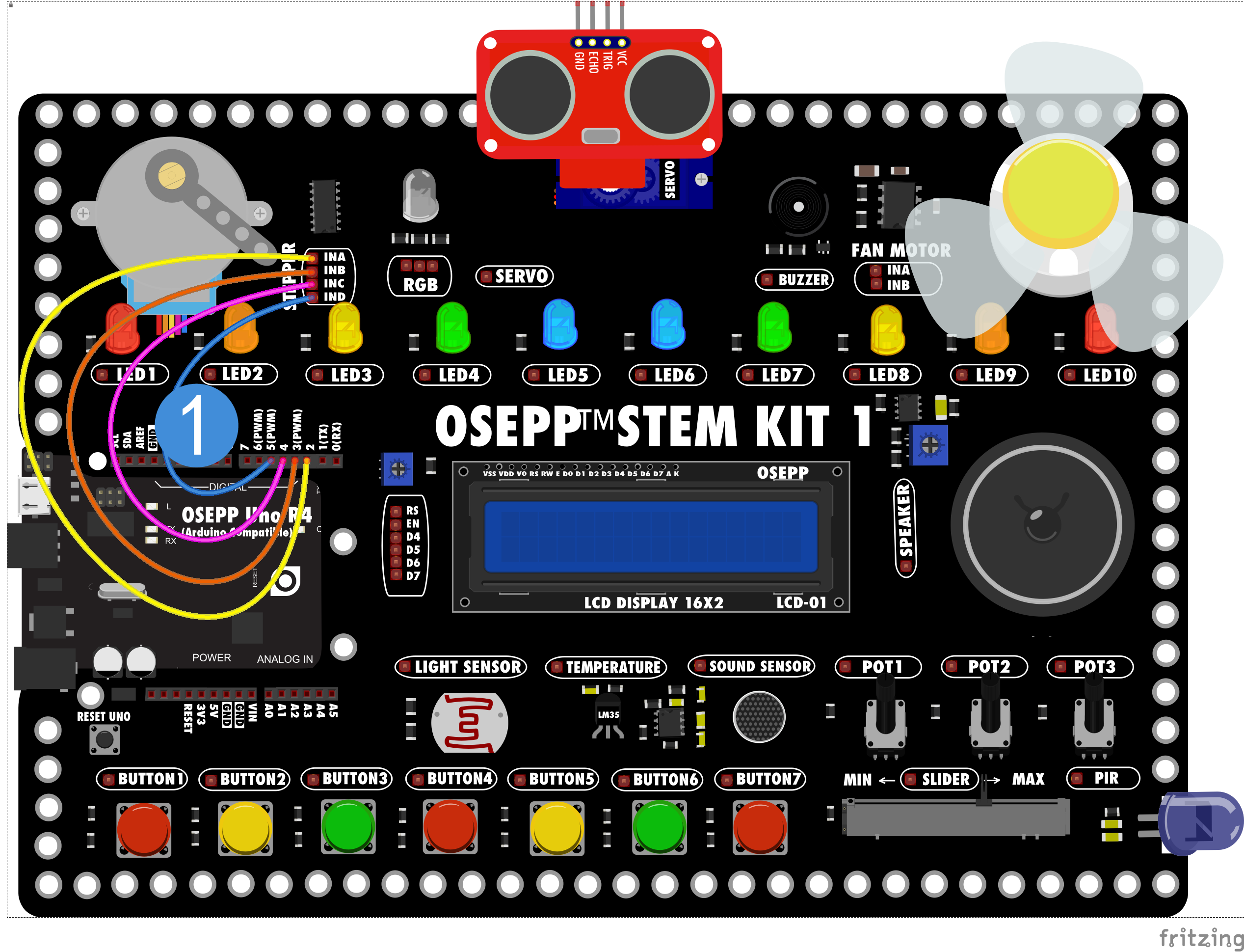 OSEPP UNO的2-5号引脚连到步进电机INA-IND。