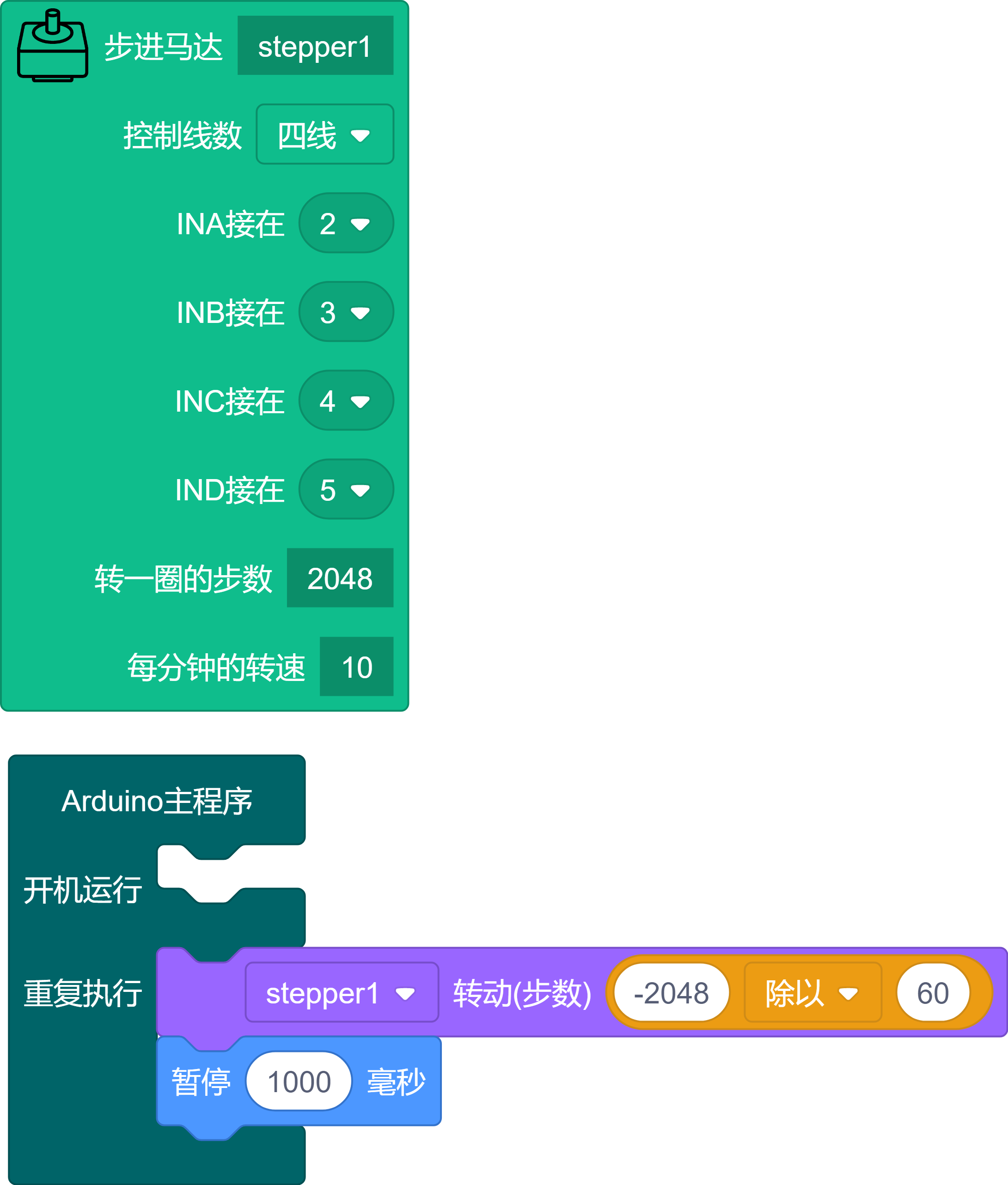 步进电机转动速度积木。如需改变,请设定值在20以内,超出这个范围步进电机无法启动。