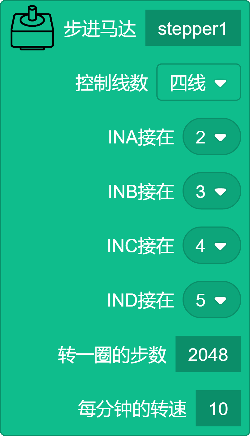 步进电机模块积木。定义步进电机的名称,引脚和一些参数。一般不需要更改。