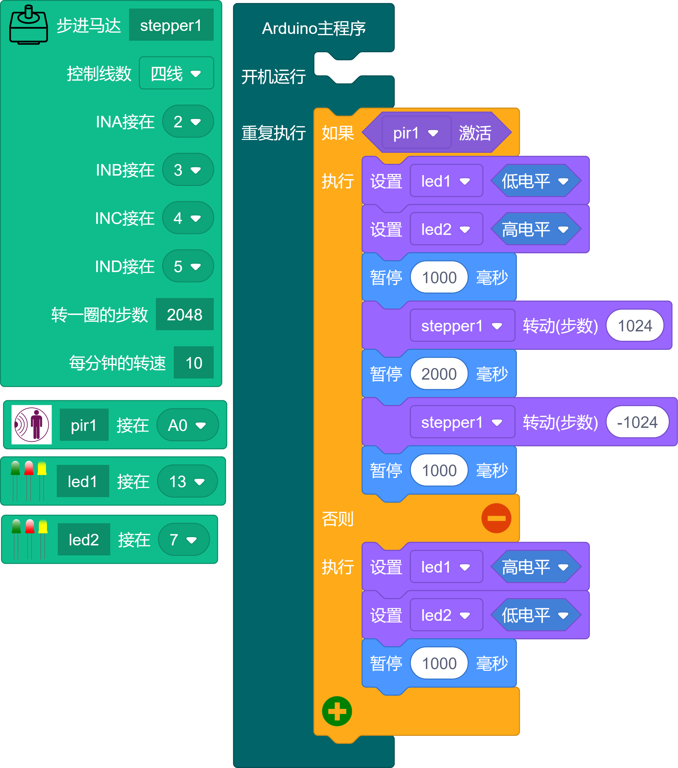当PIR检测到人体红外热源时,触发高电平。绿色LED点亮,步进马达正向转动半圈,等待2秒后反转半圈回来。然后红色LED点亮,绿色LED熄灭。