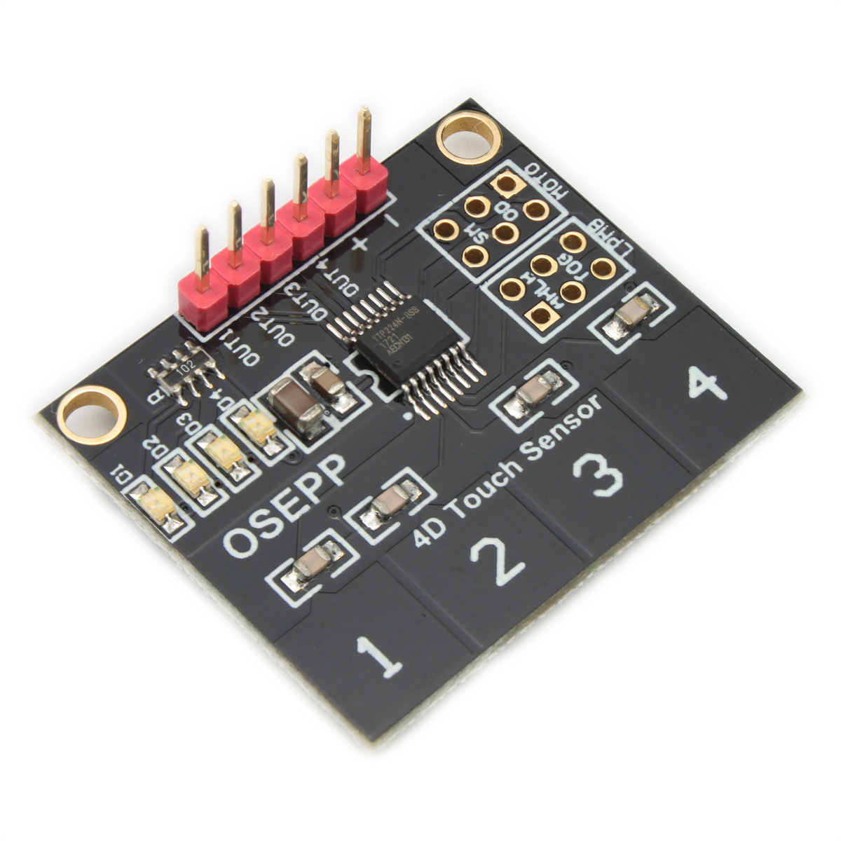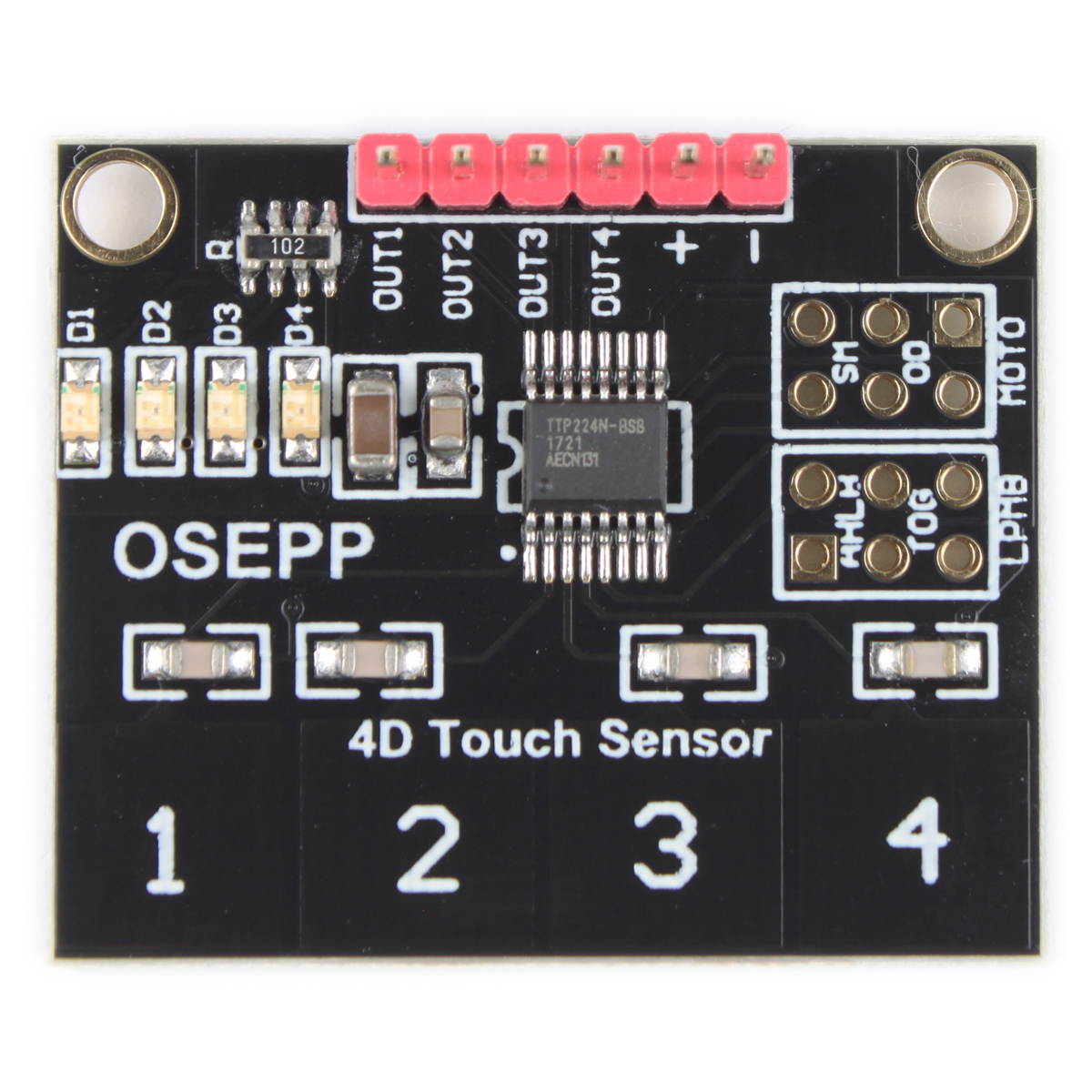 OSEPP四路电容式触摸模块提供4路电容式触摸按钮,可以感受到物体是否与传感器有接触,当人体或金属直接触碰到传感器上的金属面时,就可以被感应到。除了直接触摸金属面外,隔着一定厚度的塑料、玻璃等材料也可以感应到。可以用来制作与人体有接触的互动装置。与传感器扩展板结合使用,可以制作出非常有趣的触摸互动作品。非常适合用于Arduino DIY项目。