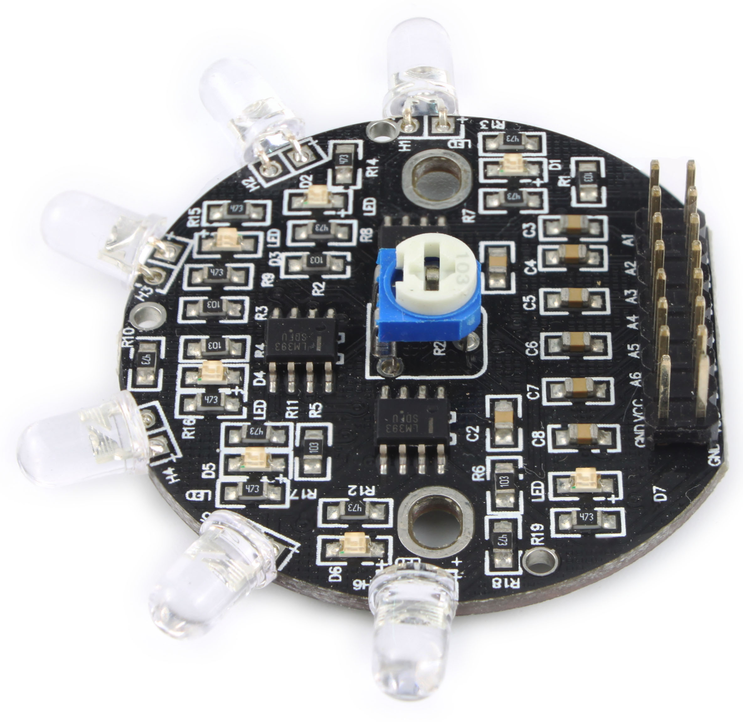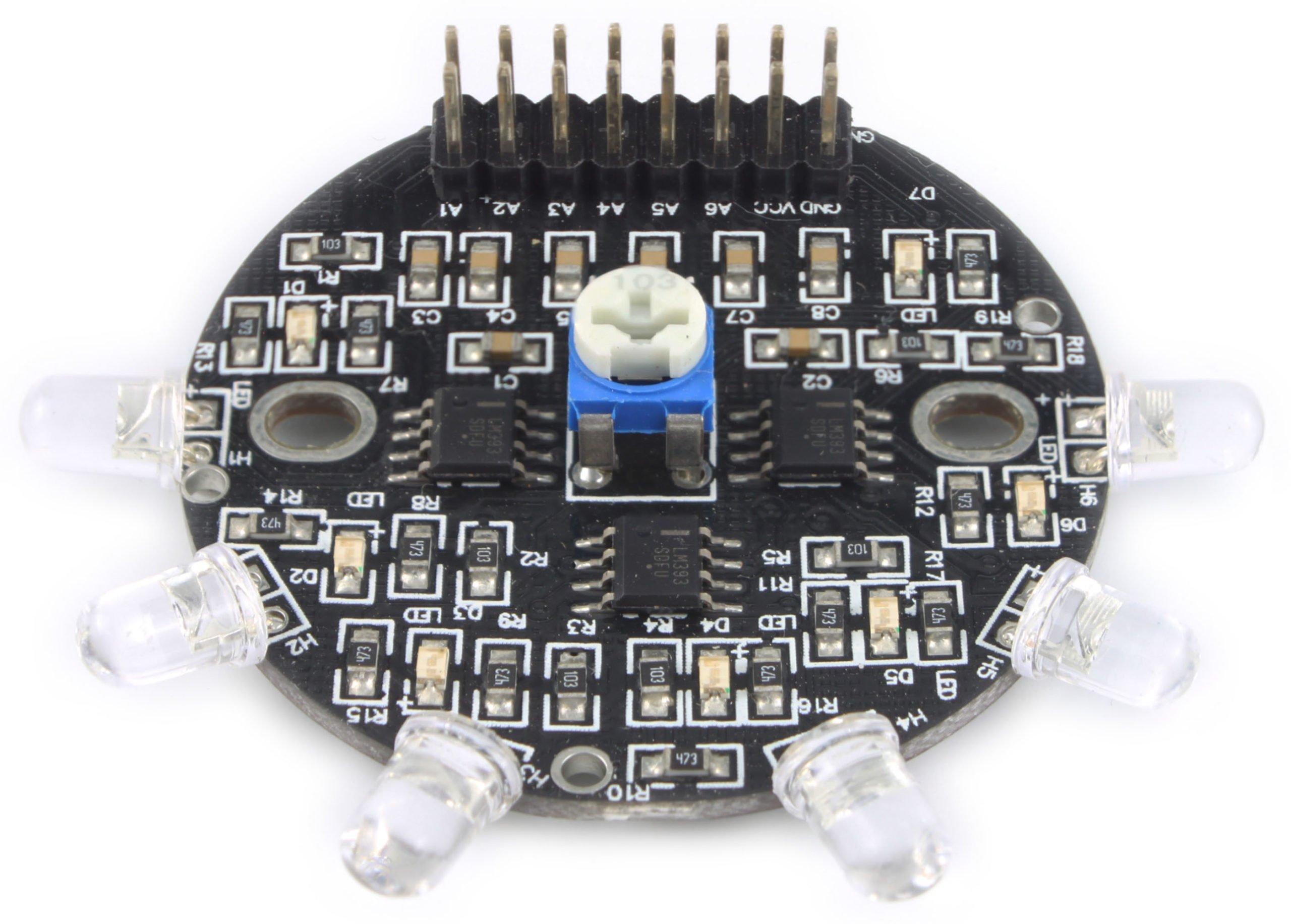 OSEPP光线传感器阵列由6个光敏二极管组成,可用于探测光线强度,通常用于追光小车、机器人。