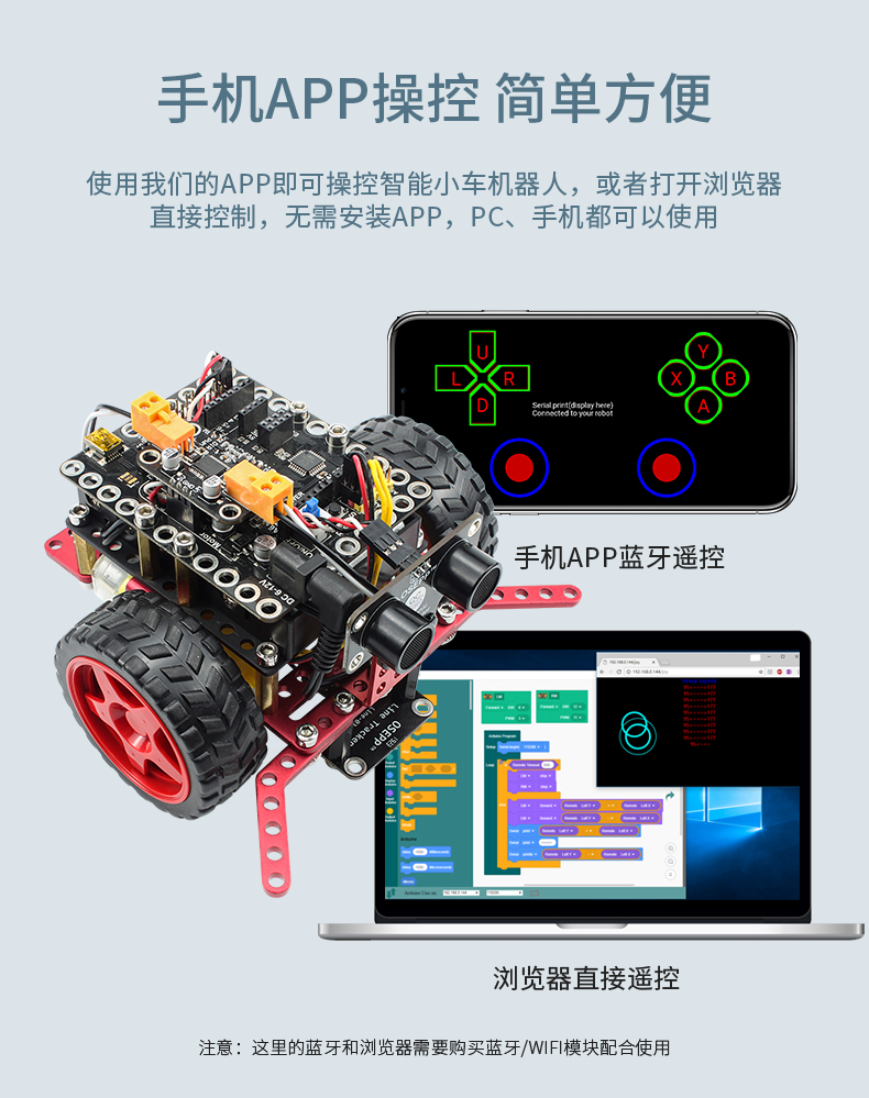 需要配套HC-08蓝牙模块,或者ESP8266 WiFi模块 进入教程