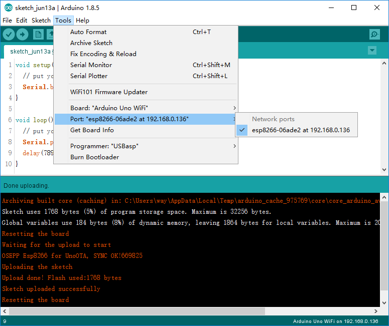 您并不能使用Uno WiFi的任何特征,只是为了使用arduino OTA - 工具->端口->网络端口->您的ESP8266对应的IP