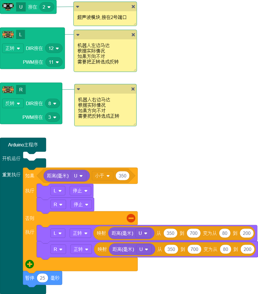 3. 如果if语句的条件不成立(障碍物距离不小于350毫米),将会执行else{}花括号中的指令。