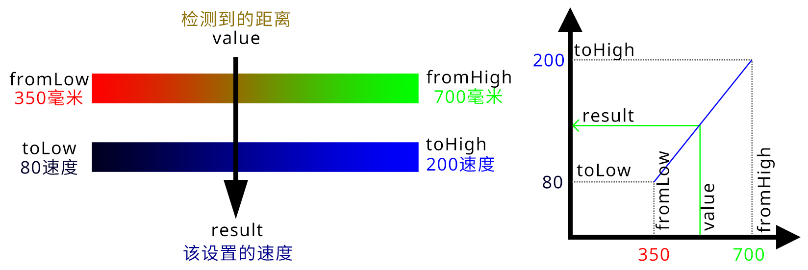 3. 假设我们打算在700毫米处开始减速,到350毫米处停下来。750毫米处的速度是200,350毫米时减速到80,在Arduino里面有一个函数可以帮我们做这个计算题。map(value, fromLow, fromHigh, toLow, toHigh),对应积木 作用是把一个数(在fromLowfromHigh之间)对应到另一个数(在toLowtoHigh之间)