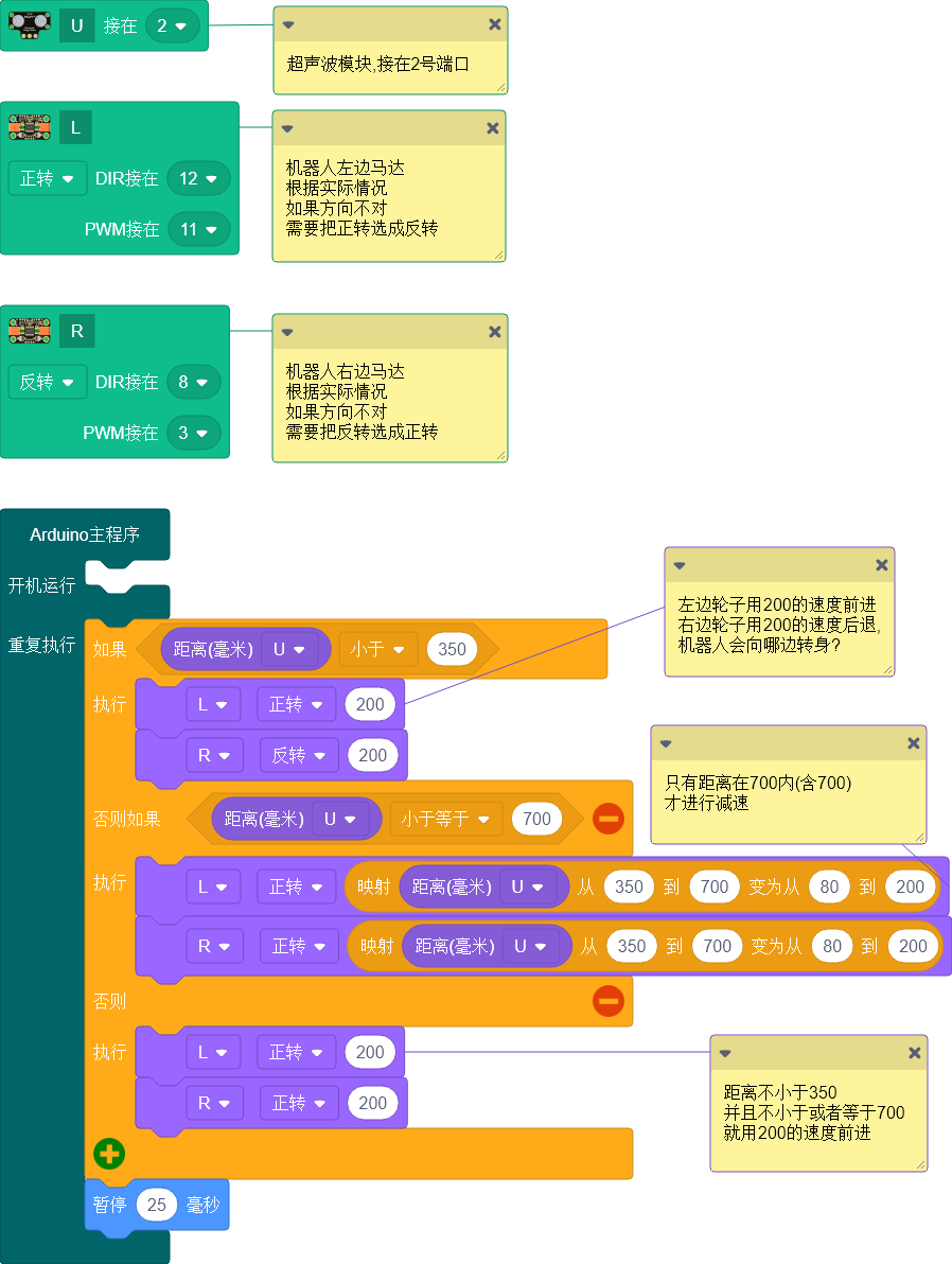 1. 上一节机器人减速前进到离障碍物350毫米的地方停下来了,需要我们帮助它才会继续走,现在它要学会自己处理。