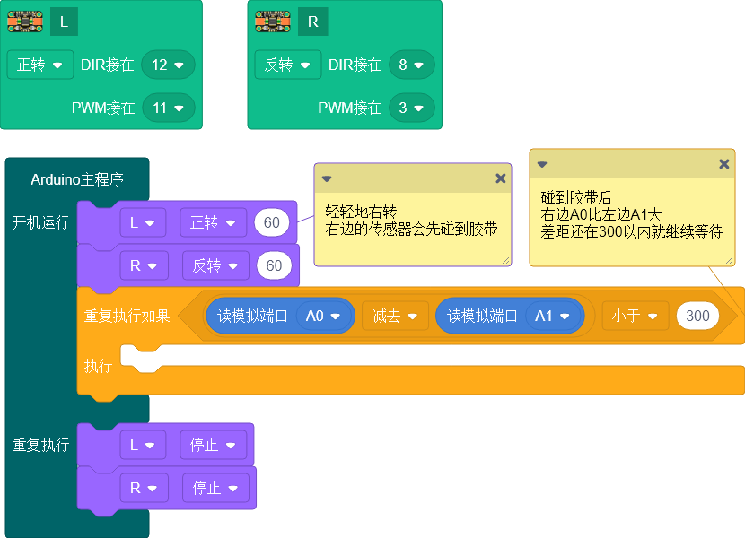 // 轻轻地右转,右边的传感器会先碰到胶带