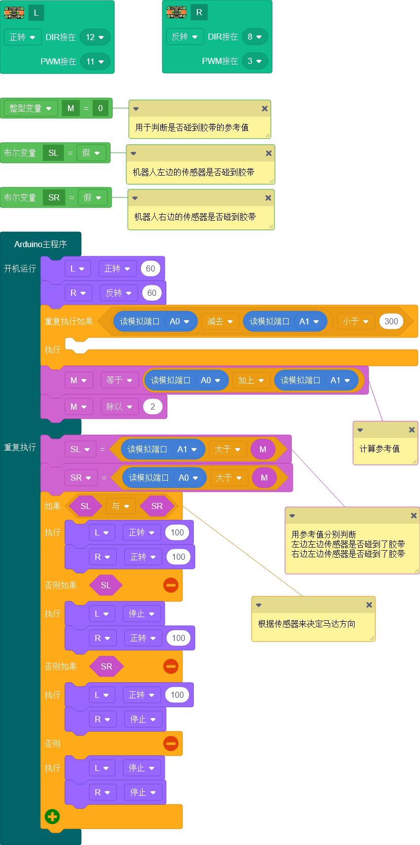 4. 分别读取两个传感器的值,各自判断它们是否大于中间数M(因为胶带的数值比较大,大于中间数代表比较像胶带),并将结果保存到变量SL = analogRead(A1) > MSR = analogRead(A0) > M;