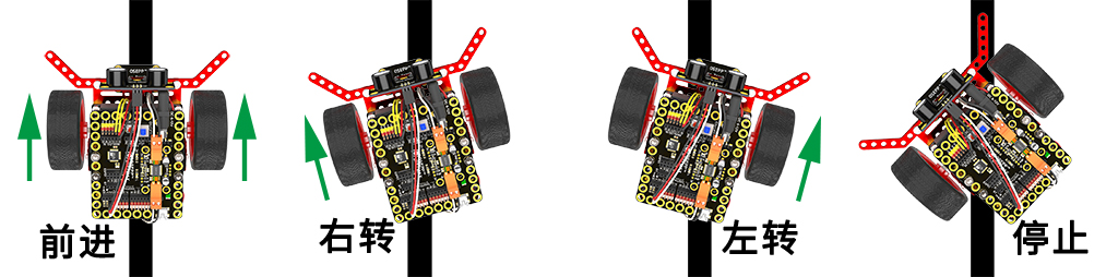 找到并认出胶带后,根据传感器的情况调整马达,实现自主巡线行驶。