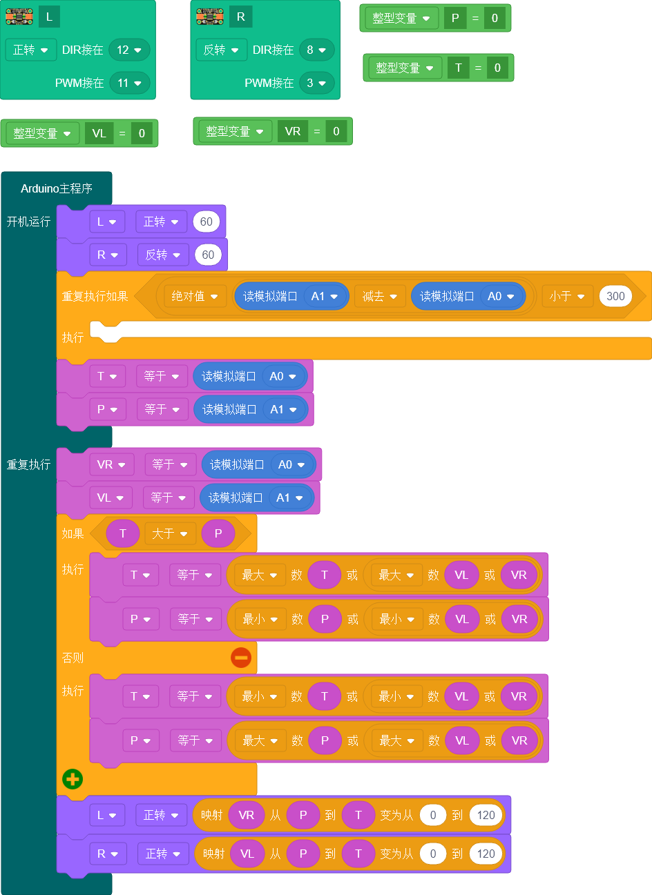 发现两种表达式是同一个功能。想法就是传感器值靠近P速度慢,值靠近T速度快。所以去掉if,两种表达式随便选一种都可以。我们保持原来的形式L.forward(map(VR, P, T, 0, 120))R.forward(map(VL, P, T, 0, 120))