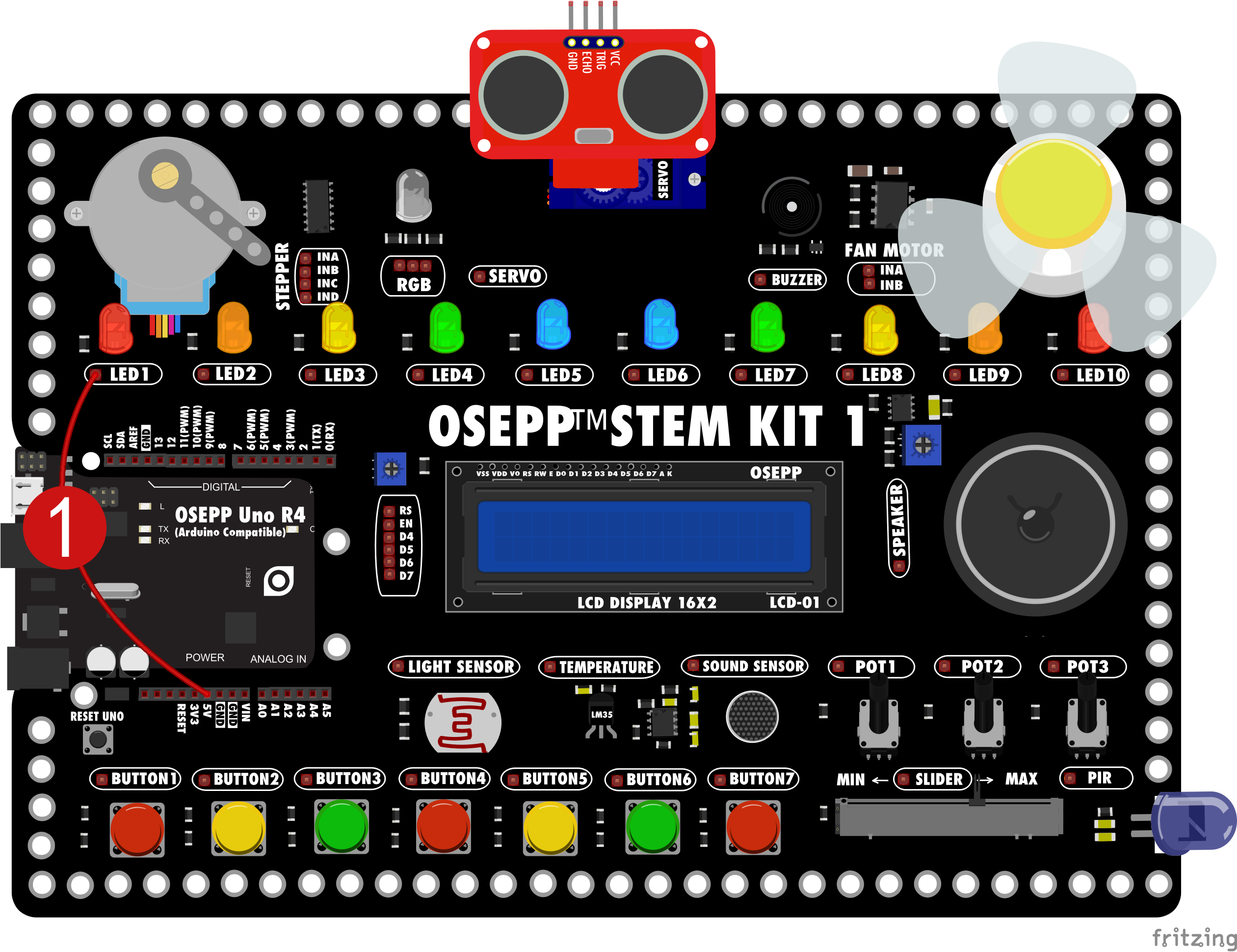 如下图中使用杜邦线连接LED1端子到OSEPP UNO控制板的5V引脚,插上USB接头后给STEM KIT供电后,LED就会发光了。